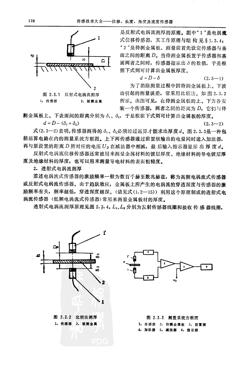 §2.3.1 屯感式 在長度、厚度測量中,其傳感器常用差動(dòng)電感式或螺管形差動(dòng)變壓器式(LVDT)位移傳感器配以相應(yīng)的機(jī)械連接部分構(gòu)成,整個(gè)機(jī)抅的max測量范圍在2米以內(nèi)。一般常用差動(dòng)電感式或螺管形差動(dòng)變壓器式傳感器制成數(shù)字式電子千分表,max分辨力可達(dá)0.01微米,量程1毫米至百余毫米;數(shù)字式電子千分卡尺,max分辨力為0.1微米,max量程數(shù)百毫米。 電子千分表(或電子千分卡尺)與機(jī)械式的相比,其優(yōu)點(diǎn)是能數(shù)字顯示,消除人眼讀數(shù)時(shí)的觀 察誤差,精度高,可輸出至微型計(jì)箅機(jī)進(jìn)行數(shù)據(jù)處理;缺點(diǎn)是價(jià)格較機(jī)械式的千分表(或千 分卡尺)昂資。 在厚度測量中,其傳感器可用兩個(gè)差動(dòng)電感式或螺管形差動(dòng)變壓器式位移傳感器組成。 測量時(shí)將兩個(gè)位移傳感器安裝在被測厚度的正面和反面,把正、反面的測量讀數(shù)(或兩者讀數(shù)的變化),經(jīng)過電子線路(或微型計(jì)箅機(jī))換算,彼此相減,即可得到所測的厚度值或厚度 的變化值。 有關(guān)差動(dòng)電感式及螺管差動(dòng)變壓器式位移傳感器的工作原理及結(jié)構(gòu),在第一章中已敘述, 在此不再贅述。 §2.3.2 電渦流式 工作原理 電渦流式測厚有反射式和透射式兩類,其原理分述如下。 1.反射式電渦流測厚 利用電渦流式位移傳感器測量金屬板的厚度是電渦流式傳感器的主要應(yīng)用之一。圖2.3.1 |