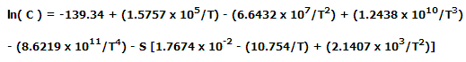 不斷監(jiān)測(cè)已固定的溶解氧探頭,被測(cè)氧氣的來源是空氣。因此,空氣或飽和水中的溶解氧,作為溫度的函數(shù),由以下方程決定: