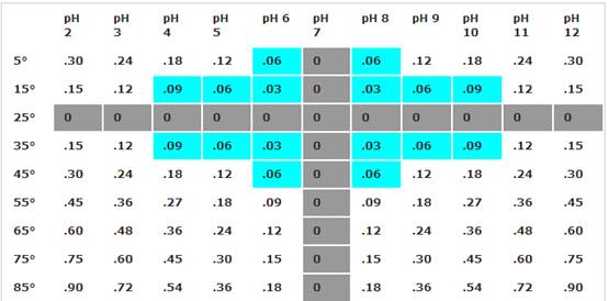 注意: 淺藍色數(shù)值的誤差小于0.1 ,可能不需要溫度補償。灰色數(shù)值是溫度和pH值,沒有溫度導(dǎo)致的pH值誤差。