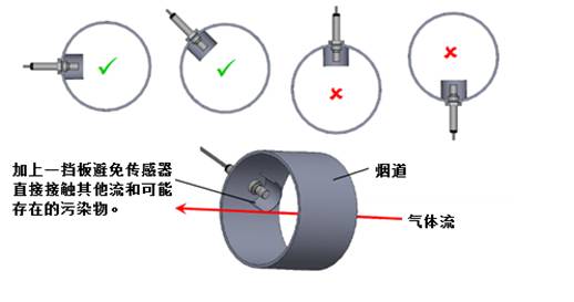 在高濕度抑或有水滴的這種環(huán)境下,應(yīng)該保護(hù)傳感器避免水直接接觸或滴落到傳感器的高溫外帽上,因?yàn)檫@樣會(huì)對(duì)傳感器的密封室和加熱器造成巨大的溫度沖擊。典型的做法是用一個(gè)透氣好的兜帽罩住傳感器的外帽或者把傳感器安裝在一個(gè)更大直徑的氣缸中。至少傳感器應(yīng)該傾斜地朝下安裝在應(yīng)用設(shè)備中,因?yàn)檫@樣子放置可以使得傳感器擺脫掉一些水汽并且不被滴落到水滴。