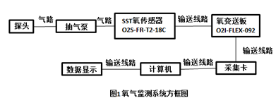 以下圖1描述了一個典型的采用SST氧化鋯探頭和變送板做成的氧氣監(jiān)測系統(tǒng)。其中,氣體采集系統(tǒng)由探頭、抽氣泵和氣路組成,氣體檢測部分則由氧化鋯傳感器和變送板組成。當(dāng)抽出的氣體流經(jīng)氧氣傳感器時,產(chǎn)生的電信號經(jīng)變送器產(chǎn)生氧氣濃度的數(shù)字信號,實(shí)時通過輸送線路至采集卡再經(jīng)計(jì)算機(jī)采集存儲,同時也可以在顯示器上顯示或儲存打印。
