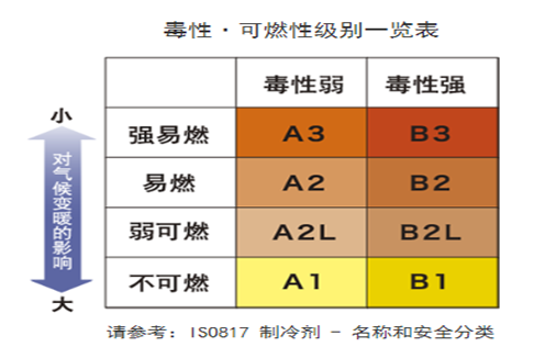 目前空調(diào)設(shè)備廣泛使用的制冷劑是化學(xué)性質(zhì)穩(wěn)定、不可燃(A1)的氟利昂,因此,即便是制冷劑泄露到空調(diào)設(shè)備外面,不必?fù)?dān)憂有起火等安全問(wèn)題。然而,不可燃(AI)的氟利昂已經(jīng)明確是引起氣候變暖的溫室效應(yīng)氣體,氟利昂排放到大氣中也會(huì)導(dǎo)致臭氧含量下降。