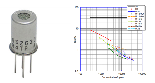 FIGARO為此研發(fā)了一款檢測(cè)新式冷媒的傳感器TGS2630。不僅對(duì)被廣泛應(yīng)用于檢測(cè)空調(diào)、冷凍設(shè)備最常使用的制冷劑R-404a、R-410a,對(duì)可降低GWP(全球氣候變暖指數(shù))的“弱可燃(A2L)制冷劑”R-32、R-1234yf以及“易燃(A3)制冷劑”R-290(主要成分為丙烷)等也有很高的靈敏度。