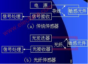 以電為基礎(chǔ)的傳統(tǒng)傳感器是一種把測量的狀態(tài)轉(zhuǎn)變?yōu)榭蓽y的電信號的裝置。它的電源、信號接收、敏感元件和處理系統(tǒng)以及信息傳輸均用金屬導(dǎo)線連接,見圖(a)。光纖傳感器則是一種把被測量的狀態(tài)轉(zhuǎn)變?yōu)榭蓽y的光信號的裝置。由敏感元件、光發(fā)送器、信號處理系統(tǒng)、光接收器以及光纖構(gòu)成,見圖(b)。