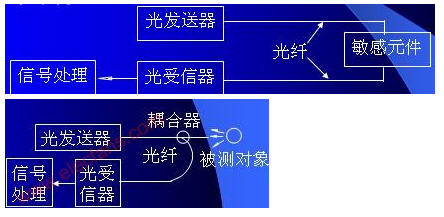 由光發(fā)送器發(fā)出的光經(jīng)源光纖引導(dǎo)至敏感元件。這時,光的某一性質(zhì)受到被測量的調(diào)制,已調(diào)光經(jīng)接收光纖耦合到光接收器,使光信號變?yōu)殡娦盘?,最后?jīng)信號處理得到所期待的被測量。