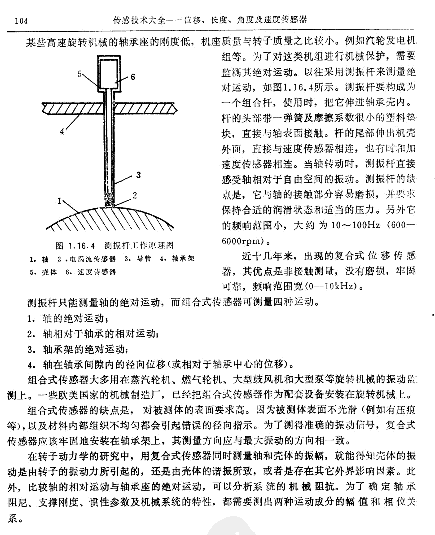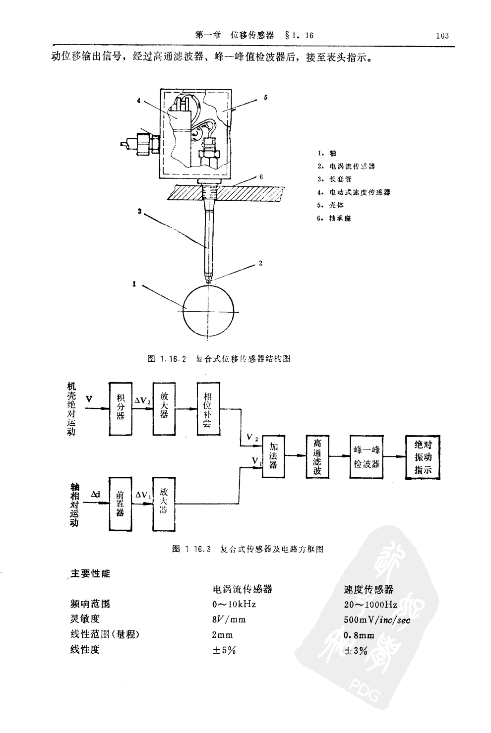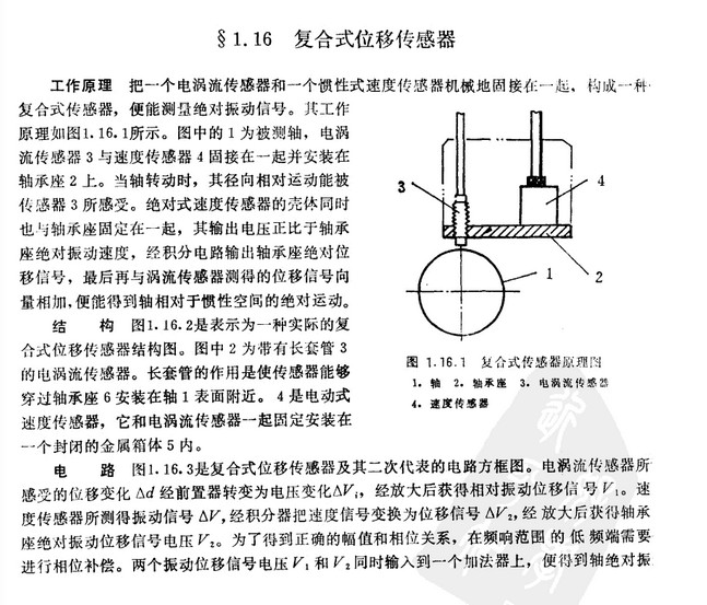 | 以下是引用片段: 工作原理 把一個電渦流傳感器和一個慣性式速度傳感器機械地固接在一起,構(gòu)成一種復(fù)合式傳感器,便能測量絕對振動信好。其工作原理如圖1.16.1所示。圖中的1為被測軸,電渦 流傳感器3與速庶傳感器4固接在一起并安裝在 軸承痤2上。為軸轉(zhuǎn)動時,其徑向相對運動能被傳感器3所感受。絕對式速度傳感器的殼體問時也與軸承座固定在一起,其輸出電壓正比于軸承 座絕對振動速度,經(jīng)積分電路輸出軸承座絕對位 移信號,最后再與渦流傳感器測得的位移位號向量相加.便能得到軸相對于慣性空間的絕對運動。 結(jié) 構(gòu) 圖1.16.2是表示為一種實際的復(fù)合式位移傳感器結(jié)構(gòu),圖中2為帶有長套管3 的電渦流傳感器。長套管的作用是使傳感器能夠 穿過軸承座6安裝在軸1表面附近。4是電動式速度傳感器,它和電渦流傳感器一起固定安裝在 一個封閉的金屬箱體5內(nèi)。 電 路 1.16.3是合式位移傳感器及其二次代表的電路方框圖。電渦流傳感器所感受的位侈變化么△d經(jīng)前置器轉(zhuǎn)變?yōu)殡妷鹤兓鱒1,經(jīng)放大后獲得相對振動位移信號V1。速 度傳感器所測得震動信號△V,經(jīng)積分器把速度信號變換為位移信號△V2,經(jīng)放大后獲得軸承座絕對振動位移位信號電壓V2。為了得到正確的幅值和相位關(guān)系,在頻響范圍的低頻端需要進行相位補償。兩個振動位移信號電壓V1和V2同時輸入到一個加法器上,使得到軸絕對振 |