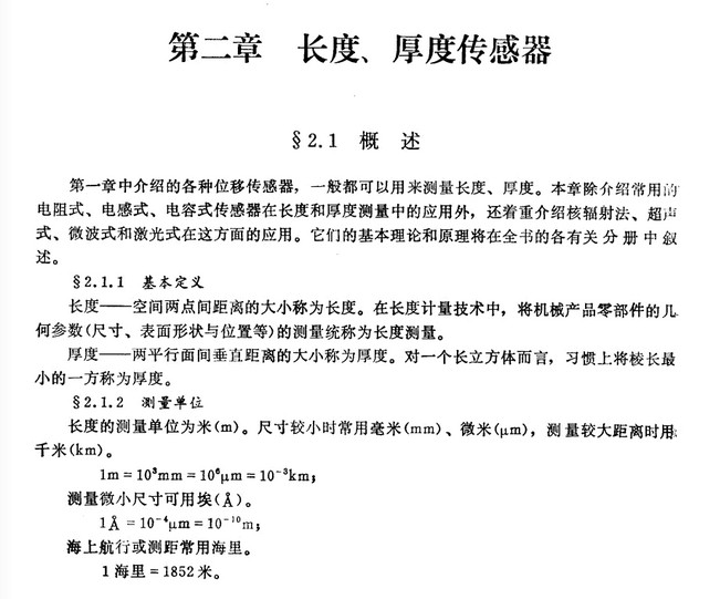 笫一章中介紹的各種位移傳感器,一般都可以用來測(cè)量長度、厚度。本章除介紹常用的電阻式、電感式、電容式傳感器在長度和厚度測(cè)量中的應(yīng)用外,還著重介紹核輻射法、超聲式、微波式和激光式在這方面的應(yīng)用。它們的基本理論和原理將在全書的各有關(guān)分冊(cè)中敘述。 §2.1.1 基本定義 長度——空間兩點(diǎn)間距離的大小稱為長度。在長度計(jì)設(shè)技術(shù)中,將機(jī)械產(chǎn)品零部件的幾何參數(shù)(尺寸、表面形狀與位置等)的測(cè)量統(tǒng)稱為長度測(cè)量。 厚度——兩平行面間垂直距離的大小稱為厚度。對(duì)一個(gè)長立方體而言,習(xí)慣上將棱長zui小的一方稱為厚度。 §2.1.2 測(cè)量單位 長度的測(cè)量單位為米(m)。尺寸較小時(shí)常用毫米(mm),微米(μm)測(cè)量較大距離時(shí)用千米(km)。 1m = lO3mm = lO6μm=10-3km; 測(cè)量微小尺寸可用埃( |