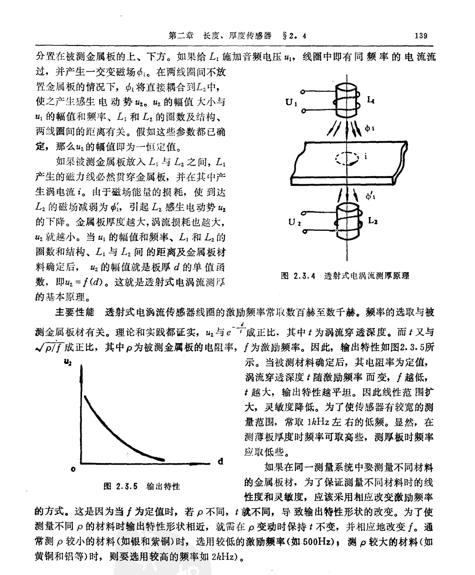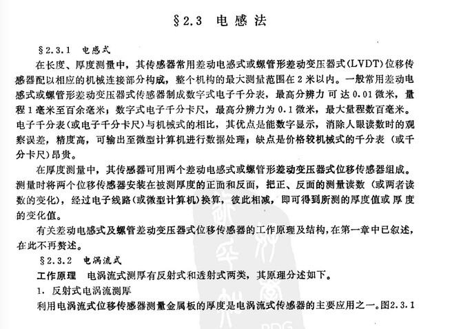 §2.3.1 屯感式 在長(zhǎng)度、厚度測(cè)量中,其傳感器常用差動(dòng)電感式或螺管形差動(dòng)變壓器式(LVDT)位移傳感器配以相應(yīng)的機(jī)械連接部分構(gòu)成,整個(gè)機(jī)抅的max測(cè)量范圍在2米以?xún)?nèi)。一般常用差動(dòng)電感式或螺管形差動(dòng)變壓器式傳感器制成數(shù)字式電子千分表,max分辨力可達(dá)0.01微米,量程1毫米至百余毫米;數(shù)字式電子千分卡尺,max分辨力為0.1微米,max量程數(shù)百毫米。 電子千分表(或電子千分卡尺)與機(jī)械式的相比,其優(yōu)點(diǎn)是能數(shù)字顯示,消除人眼讀數(shù)時(shí)的觀 察誤差,精度高,可輸出至微型計(jì)箅機(jī)進(jìn)行數(shù)據(jù)處理;缺點(diǎn)是價(jià)格較機(jī)械式的千分表(或千 分卡尺)昂資。 在厚度測(cè)量中,其傳感器可用兩個(gè)差動(dòng)電感式或螺管形差動(dòng)變壓器式位移傳感器組成。 測(cè)量時(shí)將兩個(gè)位移傳感器安裝在被測(cè)厚度的正面和反面,把正、反面的測(cè)量讀數(shù)(或兩者讀數(shù)的變化),經(jīng)過(guò)電子線路(或微型計(jì)箅機(jī))換算,彼此相減,即可得到所測(cè)的厚度值或厚度 的變化值。 有關(guān)差動(dòng)電感式及螺管差動(dòng)變壓器式位移傳感器的工作原理及結(jié)構(gòu),在第一章中已敘述, 在此不再贅述。 §2.3.2 電渦流式 工作原理 電渦流式測(cè)厚有反射式和透射式兩類(lèi),其原理分述如下。 1.反射式電渦流測(cè)厚 利用電渦流式位移傳感器測(cè)量金屬板的厚度是電渦流式傳感器的主要應(yīng)用之一。圖2.3.1 |