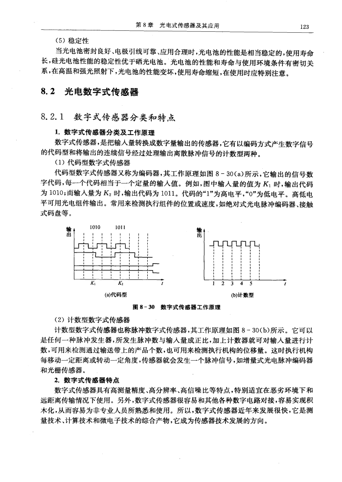 | 文摘: 8. 2. 1數(shù)字式傳感器分類(lèi)和特點(diǎn) 1.數(shù)字式傳感器分類(lèi)及工作原理 數(shù)字式傳感器,是把輸人量轉(zhuǎn)換成數(shù)字量輸出的傳感器,它有以編碼方式 (1)代碼型數(shù)字式傳感器 代碼型數(shù)字式傳感器又稱(chēng)為編碼器,其工作原理如圖8-30(a)所示,它輸出的 |