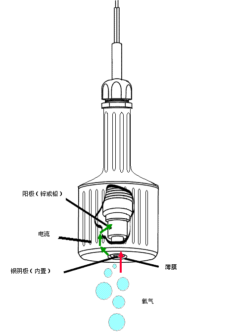 因為所有滲入探頭的氧氣都會被消耗,在電解液中的氧分壓是零。因此,一個分壓梯度存在于薄膜中和氧滲透率是空氣或被測水中氧分壓的函數(shù)。