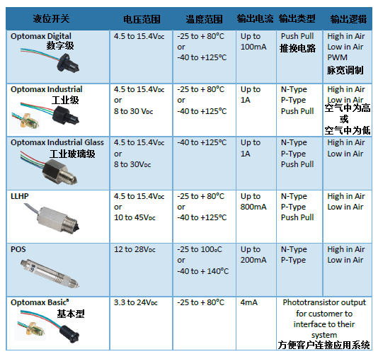 如上圖展示,在液位傳感器頂端內(nèi)的光學(xué)感應(yīng)頭上裝有LED發(fā)射器和光電晶體管。當(dāng)無(wú)液體存在時(shí),LED發(fā)出的光全部在里面反射回光電管;當(dāng)液體漫過(guò)傳感器頂端時(shí),部分光線會(huì)透射到液體里,因此光電管接收到的光強(qiáng)減少,造成傳感器輸出狀態(tài)改變。采用這種方法檢測(cè)液位非常靈敏,且無(wú)需使用運(yùn)動(dòng)部件。常用型號(hào)LLC200D3和LLC710D3-003以及LLC210D3-001等。下圖為各材質(zhì)各型號(hào)的技術(shù)規(guī)格表,僅提供客戶參考。