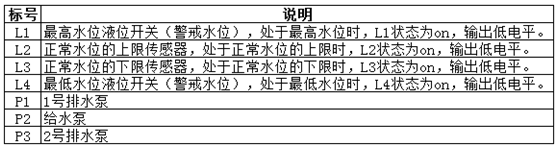 (1)正常水位時:L3、L4狀態(tài)為On,輸出低電平,L1和L2狀態(tài)為Off,輸出高電平,P1、P2和P3狀態(tài)為關(guān)閉,給水泵和排水泵都不工作。