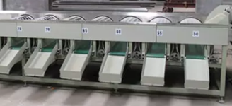 負(fù)責(zé)果品上線緩沖、勻果提升輸送、并將水果適當(dāng)翻轉(zhuǎn)以便人工分揀出損毀的水果。