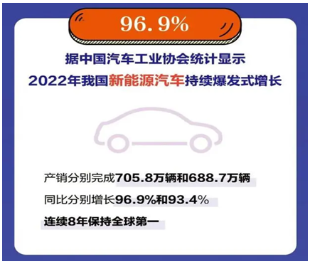 中汽協(xié)數(shù)據(jù)顯示,我國新能源汽車持續(xù)爆發(fā)式增長,2022全年產(chǎn)銷分別完成705.8萬輛和688.7萬輛,同比分別增長96.9%和93.4%,連續(xù)8年位居全球第一,且市場占有率提升至25.6%,高于上年121個百分點,逐步進入全面市場化拓展期,迎來新的發(fā)展和增長階段。新能源汽車新車銷量占汽車新車總銷量的25.6%,提前三年完成2025年規(guī)劃目標。由此可見我國新能源汽車的發(fā)展前景是相當好。