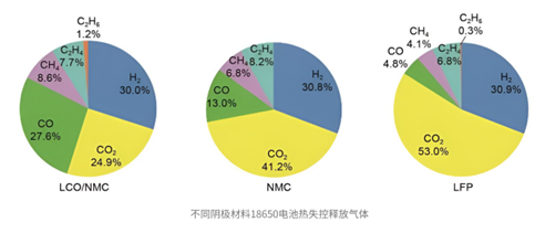 鋰電池熱失控時會放出大量氣體,不同種類的含鋰陰極材料熱失控時釋放的氣體很相似,最主要的氣體有H2、CO、CO2、CH4等。