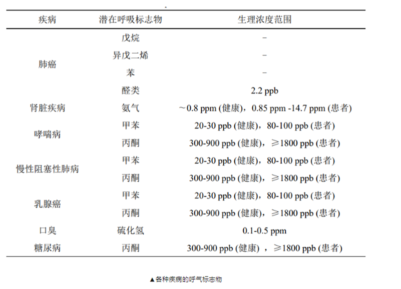 人體呼吸氣中的揮發(fā)性有機(jī)化合物(Volatile Organic Compounds, VOCs)可以作為身體狀況的呼氣生物標(biāo)志物。它們的成分和濃度可能因人體健康狀況而不同。