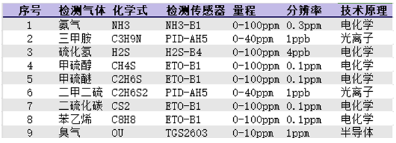 根據(jù)國家《惡臭污染物排放標(biāo)準(zhǔn)(GB14554-1993)》,控制惡臭的物質(zhì)只包含氨、三甲胺、硫化氫、甲硫醇、甲硫醚、二甲二硫、二硫化碳、苯乙烯、惡臭OU值在內(nèi)的九個指標(biāo)。因此,深圳新世聯(lián)科技有限公司推薦惡臭電子在線監(jiān)測系統(tǒng)中傳感器選型如下: