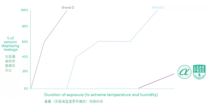 競(jìng)爭(zhēng)對(duì)手的傳感器最終失效, Alphasense 85%的傳感器仍然沒有漏液。